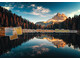 Aerial view of Lago Antorno, Dolomites, Lake mountain landscape with Alps peak , Misurina, Cortina d'Ampezzo, Italy. Reflected the famous Tre Cime di Lavaredo.