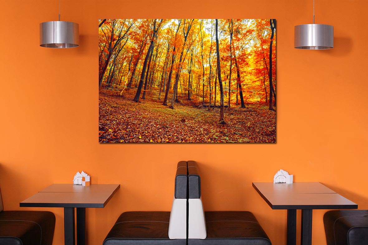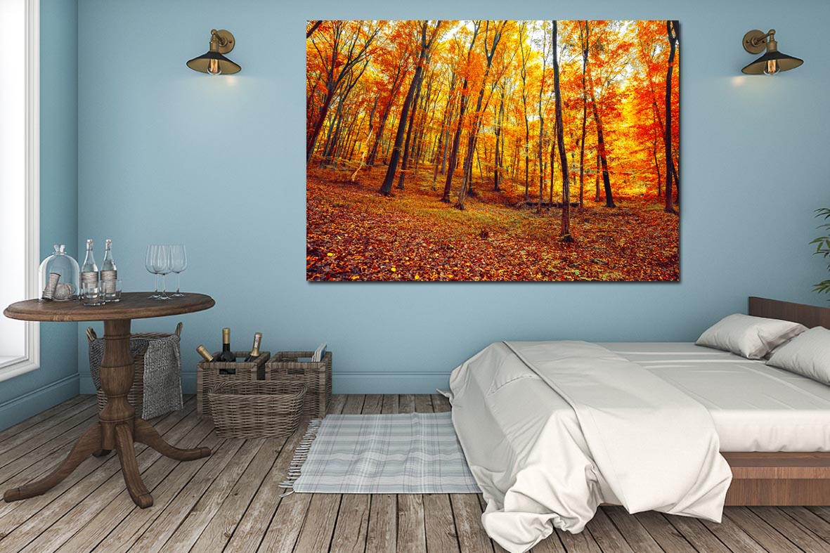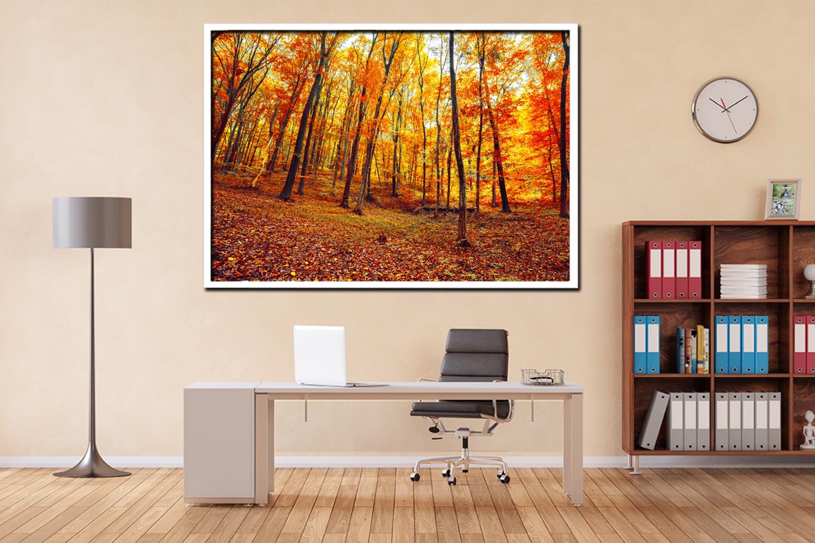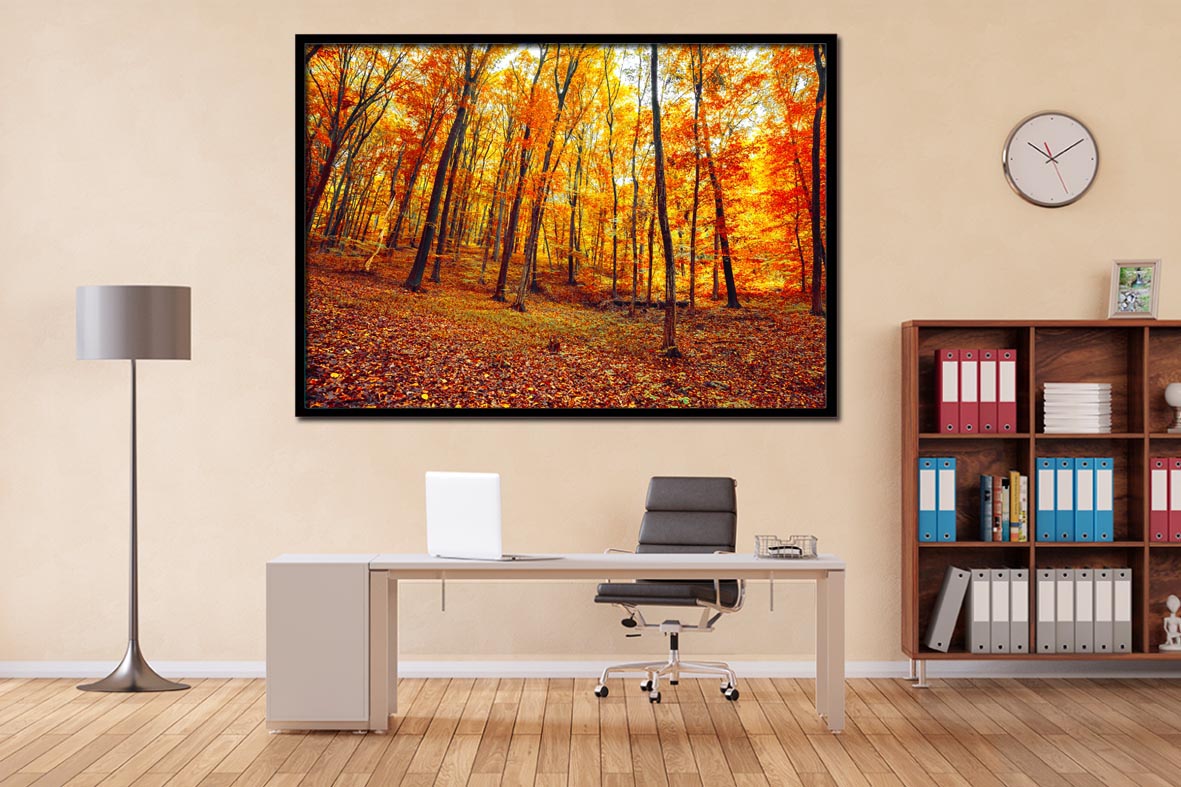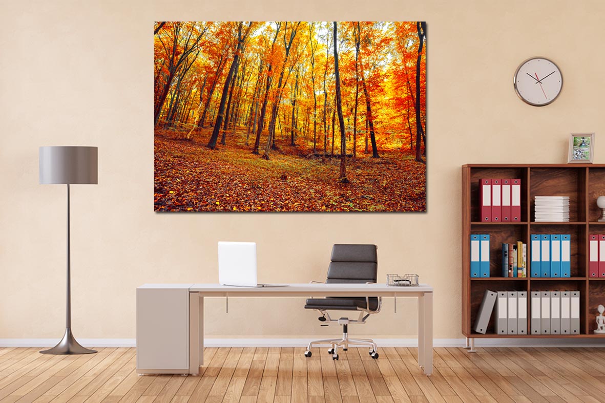 Ένας πίνακας με χρυσό φως ή ηλιοβασίλεμα μέσα σε φθινοπωρινό δάσος αποπνέει ηρεμία και πληρότητα. Σε έναν χώρο γραφείου ή καθιστικού, το χρυσό φως λειτουργεί σχεδόν θεραπευτικά, ανακουφίζοντας από το στρες και ενισχύοντας την αίσθηση επιτυχίας και εσωτερικής ισορροπίας.