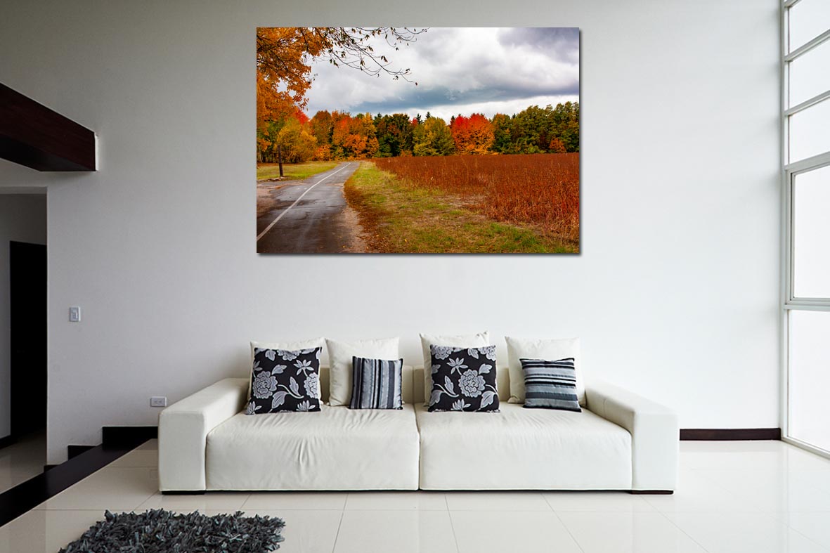 Ένα μεγάλο έργο καμβά με φωτογραφία ενός φθινοπωρινού δάσους ή ενός δρόμου γεμάτου πεσμένα φύλλα μπορεί να λειτουργήσει ως κεντρικό σημείο αναφοράς στο σαλόνι, πλαισιώνοντας τον χώρο με αίσθηση γαλήνης και βάθους. Αντί για πολλά μικρά κάδρα, ένα μεγάλο έργο στον τοίχο του καθιστικού μπορεί να προσφέρει δυναμισμό και συνοχή.
