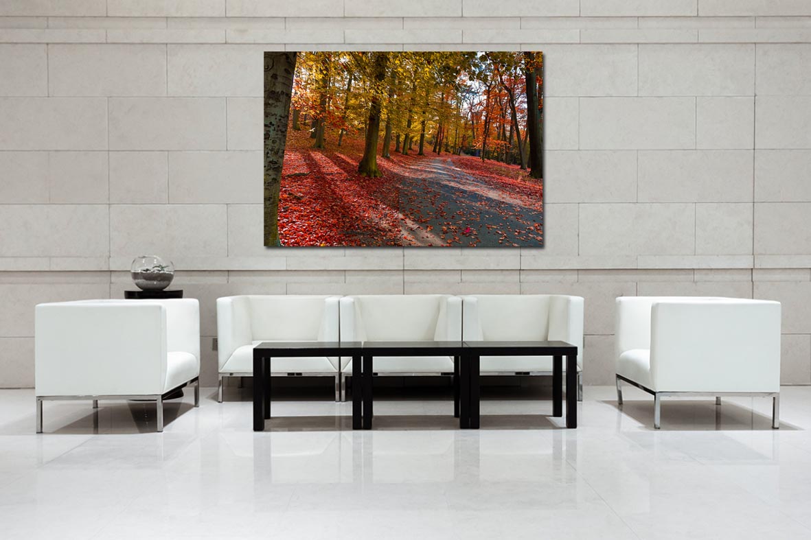 Ένα μεγάλο έργο καμβά με φωτογραφία ενός φθινοπωρινού δάσους ή ενός δρόμου γεμάτου πεσμένα φύλλα μπορεί να λειτουργήσει ως κεντρικό σημείο αναφοράς στο σαλόνι, πλαισιώνοντας τον χώρο με αίσθηση γαλήνης και βάθους. Αντί για πολλά μικρά κάδρα, ένα μεγάλο έργο στον τοίχο του καθιστικού μπορεί να προσφέρει δυναμισμό και συνοχή.