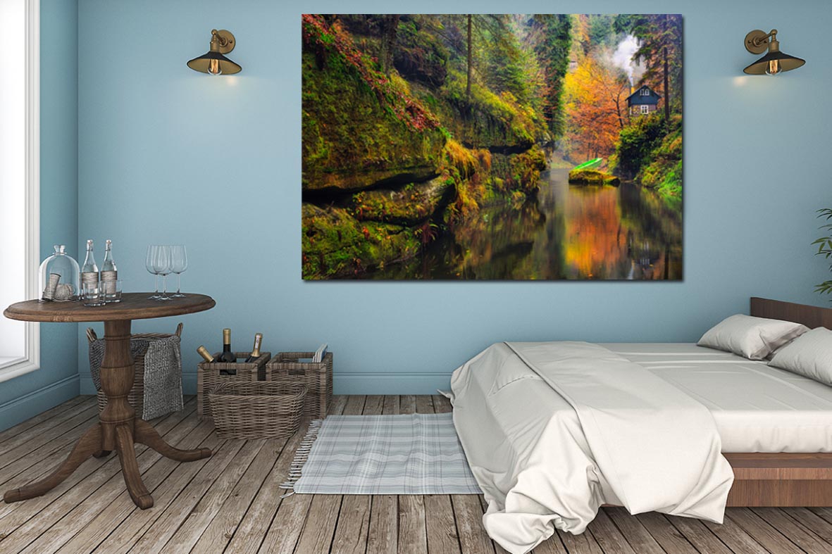 Οι πίνακες του Print-Photos-Online.com με φθινοπωρινά τοπία φέρνουν αυτήν τη θεραπευτική επίδραση μέσα στο σπίτι. Κάθε εικόνα λειτουργεί σαν αναπνοή γαλήνης μέσα στην καθημερινότητα: – Μια ομίχλη που απλώνεται σε ένα βουνό. – Ένα ποτάμι που κυλά ανάμεσα σε δέντρα. – Ένα μονοπάτι καλυμμένο με φύλλα.